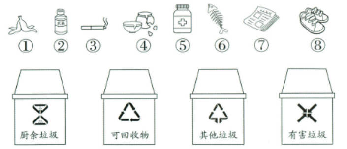 【解析】【解答】解:厨余垃圾有①⑥;可回收垃圾有⑦⑧;其他垃圾有③④;有害垃圾有②⑤。