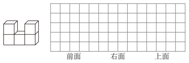 【分析】从前面看共有2行,上面1行2个小正方形,左右两边各1个小正方形,下面1行3个小正方形,从右面看共有2行,上面1行1个小正方形,下面1行1个小正方形;从上面看共有1行,3个小正方形;据此画图即可。