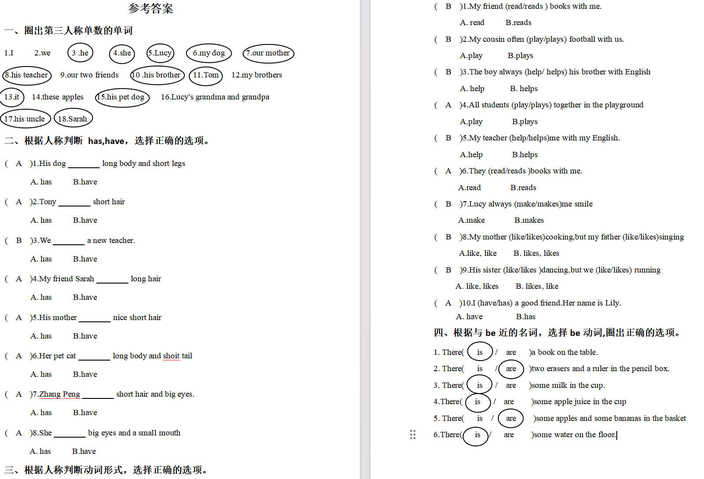 四、根据与be近的名词,选择be动词,圈出正确的选项。