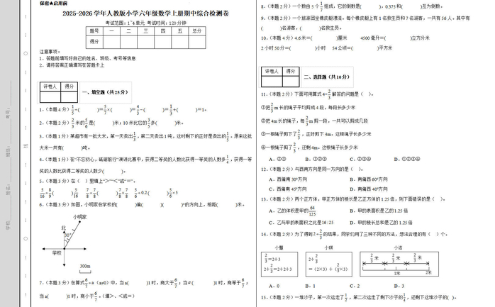 6.(本题3分)如图,小明家在学校的( )偏( )( )°的方向上,相距( )米。