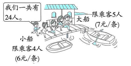 租船方案 | 大船 | 小船 | 可坐人数 | 需要钱数 |