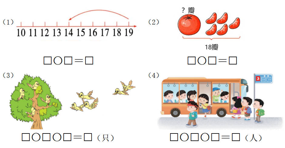 1.(1)19-5=14 (2)18-5=13 (3)4+3+2=9 (4)7-2+3=8