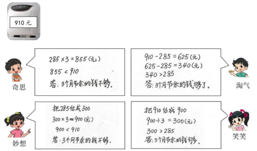 8.林林的哥哥勤工俭学,平均每个月节余285元,他想用每月节余的钱为奶奶买一台小洗衣机(如下图),3个月节余的钱够吗?下面同学们的想法正确的( )