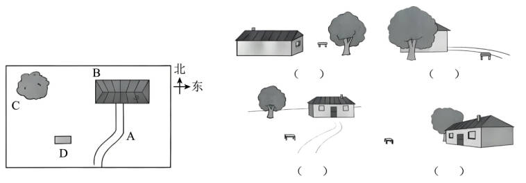 下面左面的图是从空中看到的情况,右面四幅图分别是A、B、C、D哪个位置看到的?填一填。