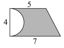 【分析】看图可知,阴影部分的面积=梯形面积-半圆的面积,梯形面积=(上底+下底)×高÷2,半圆的面积=圆周率×半径的平方÷2,据此列式计算。