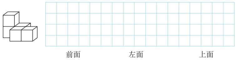 【分析】观察立体图形,从前面能看到两层4个小正方形,下层有3个,上层有1个且居左;从左面能看到两层3个小正方形,下层有2个,上层有1个且居左;从上面能看到三列4个小正方形,左列1个且居上,中列2个,右列1个且居下;据此画出从前面、左面、上面看到的形状。