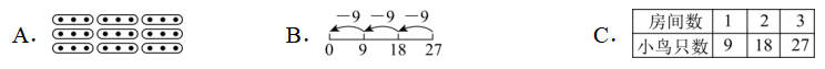 【详解】A.运用点子图,有9个框表示9间房子,每个框里有3个点表示3只小鸟住一间房子,共计27个点;用点子图表示的是27里面9个3,并没有表示出27里面有几9;故思考过程是错误的。