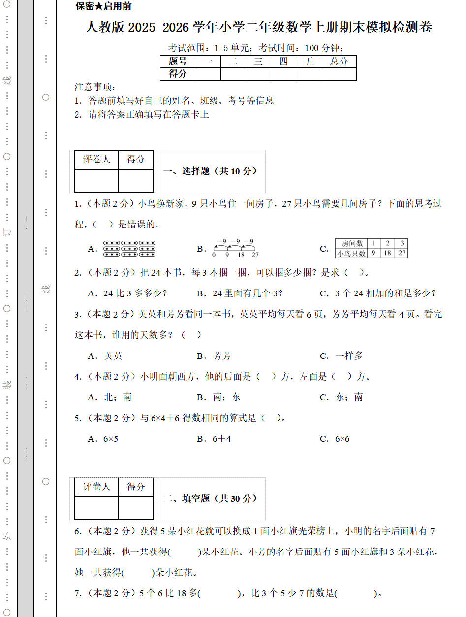 1.(本题2分)小鸟换新家,9只小鸟住一间房子,27只小鸟需要几间房子?下面的思考过程,( )是错误的。