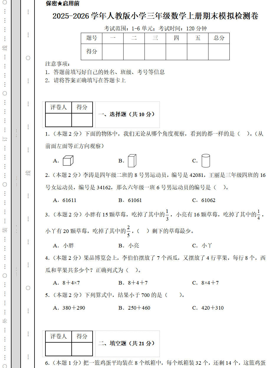 1.(本题2分)下面的物体中,我们无论从哪个角度观察,看到的都一样的是( )。(从前面左面等正方向观察)
