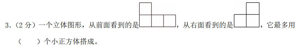 3.(2分)一个立体图形,从前面看到的是,从右面看到的是,它最多用( )个小正方体搭成。