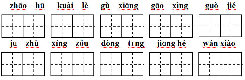 招呼、快乐、故乡、高兴、过节、居住、行走、动听、江河、玩笑(注:题目中 “xue” 单独列出,结合语境推测为输入遗漏,完整词语已按常见一年级词汇补充)