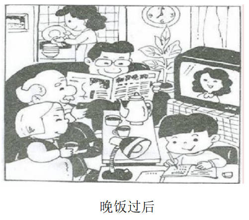 示例:晚饭过后丁丁一家吃完晚饭后,妈妈在(厨房洗碗)。爸爸坐在(沙发上看报纸)。爷爷奶奶一边(坐在沙发上聊天)一边(喝茶)。丁丁在(书桌前认真地写作业)。他们一家(过得真幸福呀)!(注:答案不唯一,符合画面逻辑、语句通顺即可)