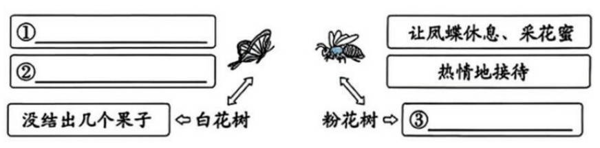 ⑤转眼间秋天到了,因为蝴蝶蜜蜂们给粉花树的花儿传了粉,树上结出了很多饱满的果子;白花树呢,花儿谢了之后,并没结几个果子。
