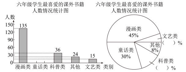 (2)用总人数乘喜欢童话类课外书籍的人数所占百分比30%即可求出喜欢童话类课外书籍的人数;用喜欢科普类课外书籍的人数36人除以总人数再乘100%即可求出其所占百分比;用喜欢文艺类课外书籍的人数15人除以总人数再乘100%即可求出其所占百分比;
