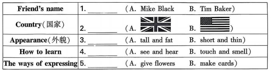 四、听John介绍在英语活动中认识的新朋友,选出正确的答案。(听两遍)(共10分)
