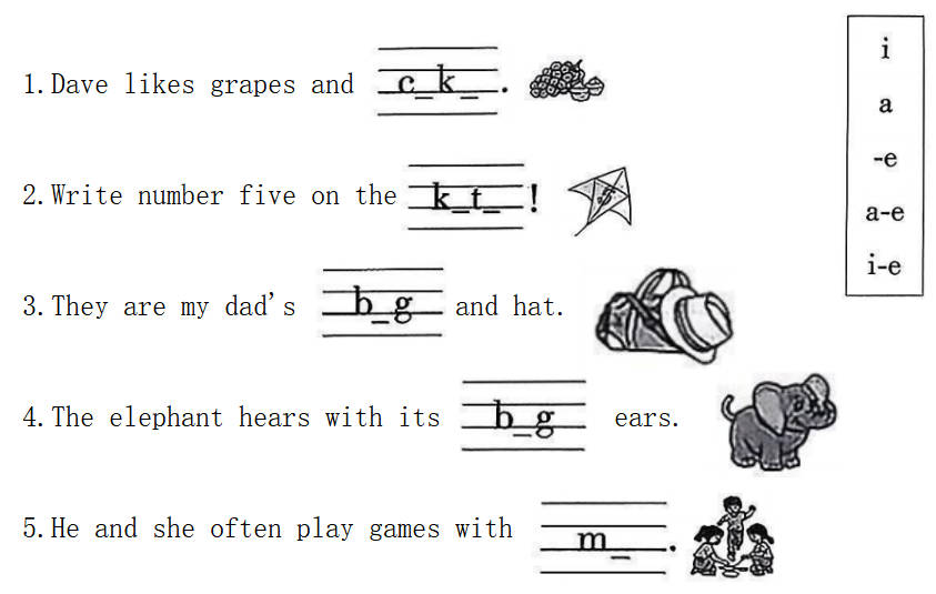 五、1.cake 2.kite 3.bag 4.big 5.me