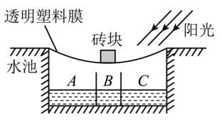 8. 海水淡化可以有效缓解全球水资源短缺这一危机。已知盐的熔点为801℃,沸点为1413℃。有一种简便的海水淡化方法:在地面上挖一水池,往池内灌海水,按如图所示完成设备的安装,即可收集淡水。这是因为阳光照射使池内海水先发生______(填物态变化名称),然后在塑料膜上发生______(填物态变化名称)形成小水滴。收集到的淡水会集中在______(选填“A”“B”或“C”)区域。