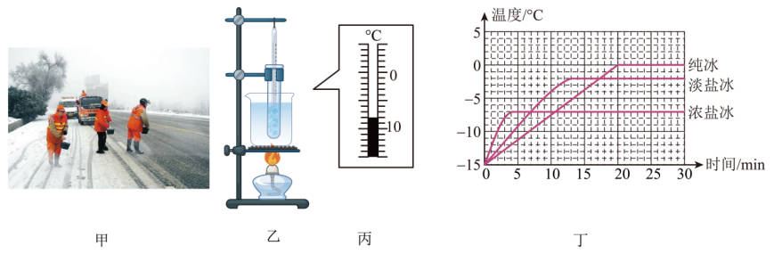(4)实验测得的温度变化如图丁所示,由图可知:15min时的浓盐冰处于______状态,此时纯冰______(选填“已经”或“还没”)开始熔化。淡盐冰的凝固点为______℃。当路上积雪较多时,往雪上撒盐是通过______来达到使雪尽快熔化的目的。